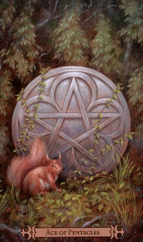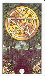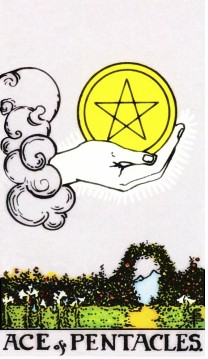 If the Ace of Pentacles is drawn in a reading, this usually means there is a beginning of new business; enterprise; success in money matters. This card may also represent the Great Path of Huna Righteousness, (ke alanui e pono ia Huna) or for that matter, any path of spiritual enlightenment.