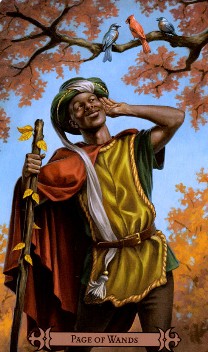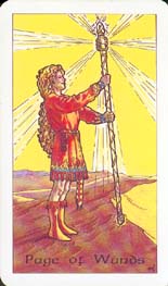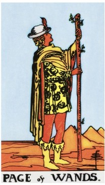 The Page of Wands is a messenger bringing you opportunities for passion creativity, courage, charm and inspiration In readings, this Page suggests that an opening may appear that excites you, feeds your talents, or dares you to be great. When you see such a chance, act on it!