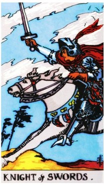 The Knight of Swords is the most active card of the entire deck. He rights wrongs. It indicates the necessity for powerful, dynamic, persuasive action. Knight of Swords, "Experienced and Dynamic Aggression"
