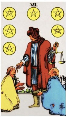 The Six of Pentacles indicates a need to give or receive charity; spread/share the wealth.