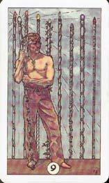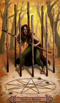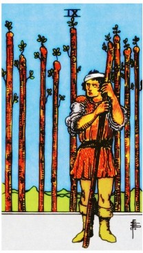 The Nine of Wands indicates the way is blocked; or the harvest is guarded.